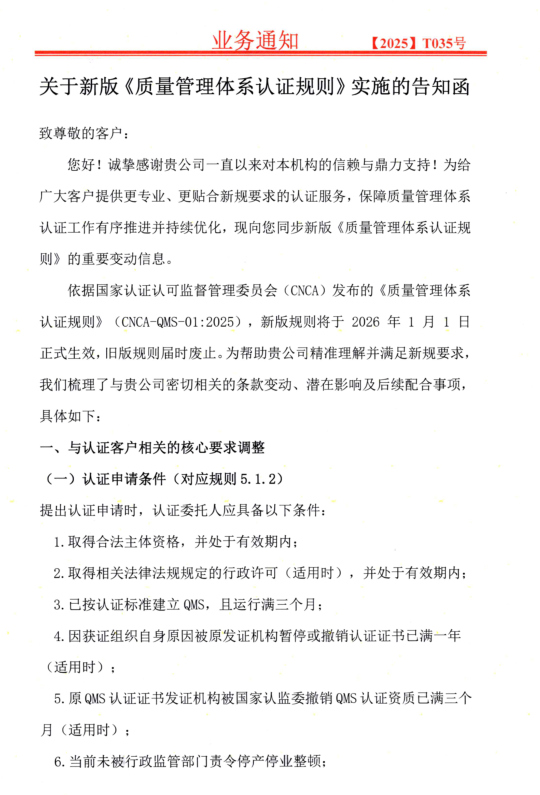 关于新版《质量管理体系认证规则》实施的告知函